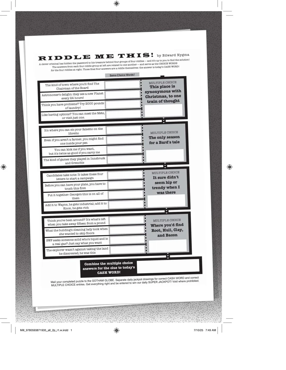 یکی از نکات جالب این کتاب، گنجاندن بخشهایی از معماهای واقعی ریدلر است جدولهایی که خواننده میتواند خودش حل کند. این ایده باعث میشود ارتباطی تعاملی بین مخاطب و داستان شکل بگیرد، چیزی که در دنیای مدرن محتوا بسیار ارزشمند است.