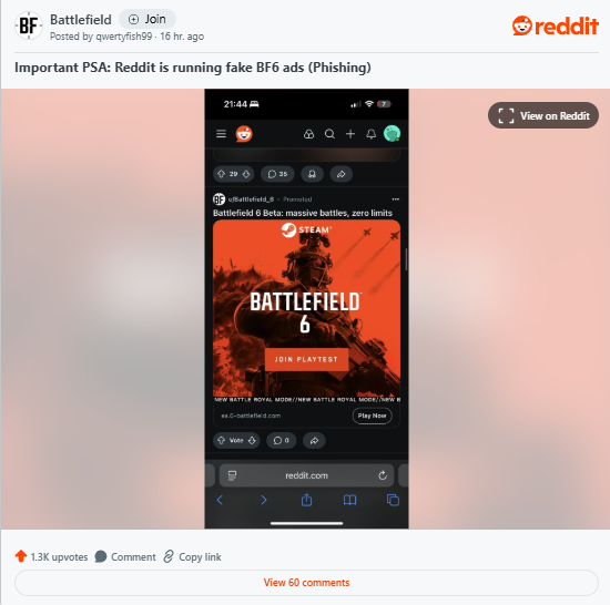 • روی هیچ تبلیغ Battlefield 6 در ردیت کلیک نکنید، حتی اگر حرفه‌ای به نظر می‌رسد.