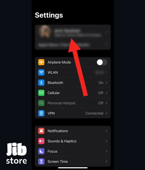 در بالای صفحه، روی Apple ID (عکس پروفایل و نام کاربری شما) کلیک کنید.