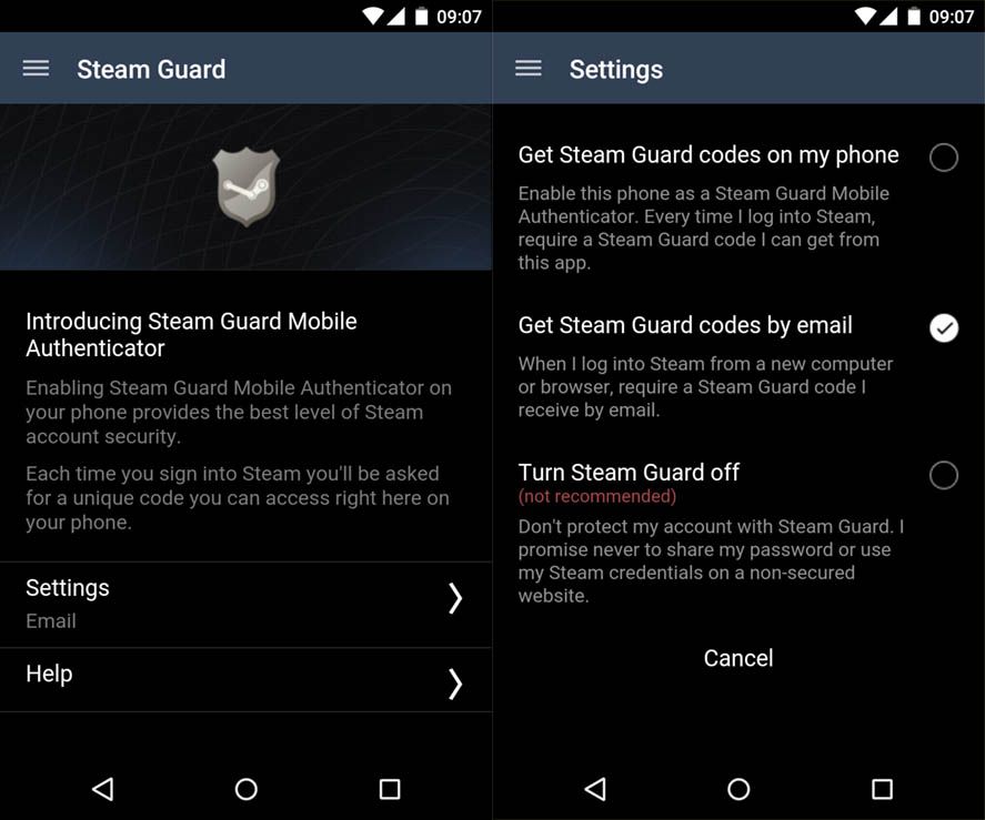 برای فعال کردن استیم گارد دو مسیر پیش رو دارید: از طریق ایمیل یا از طریق اپلیکیشن موبایل. در حالت اول، استیم یک کد امنیتی را هنگام ورود به اکانت به ایمیلتان ارسال میکند. اما روش دوم — یعنی استفاده از اپلیکیشن Steam — امنتر و سریعتر است.