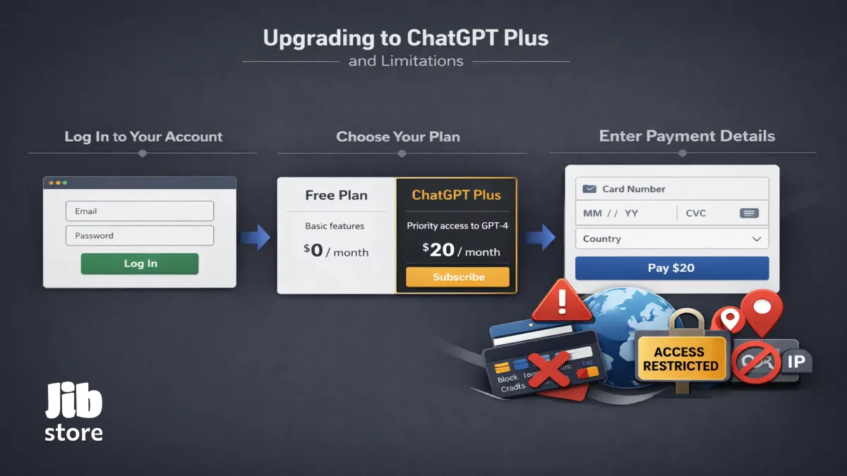 روش دوم که برای کاربران ایرانی بسیار سادهتر، کمریسکتر و مقرونبهصرفهتر است، کمک گرفتن از شرکتهای واسط معتبر مانند جیب استور است. در این روش، شما درگیر پیچیدگیهای ارزی، ساخت ویزا کارت یا تغییر آدرس نمیشوید؛ بلکه تمام مراحل خرید اکانت ChatGPT پلاس را به متخصصان میسپارید.