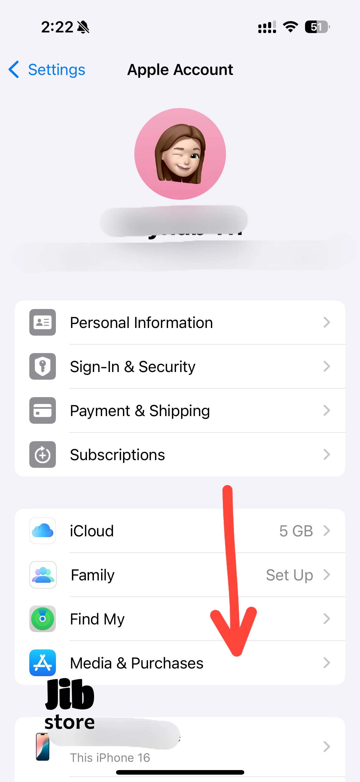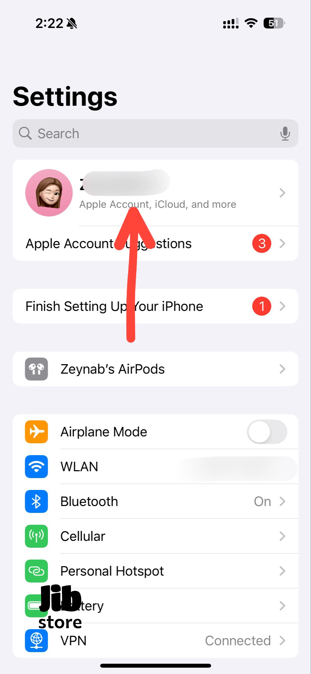 - در بالای صفحه، روی اسم خودتان (که اپل آیدی شماست) ضربه بزنید.