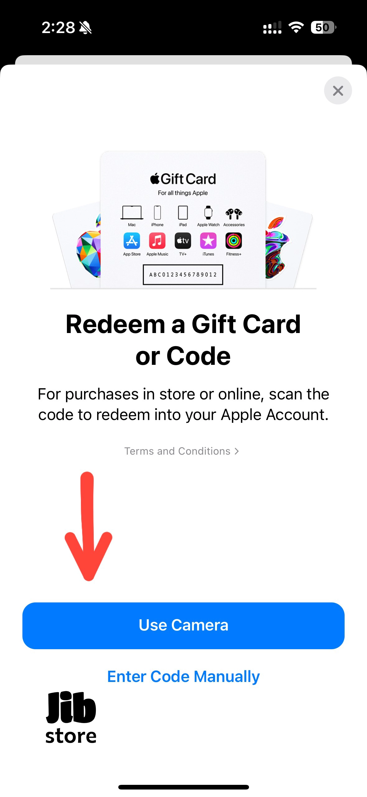 - گزینهی Redeem Gift Card or Code (استفاده از گیفت کارت یا کد) را انتخاب کنید.